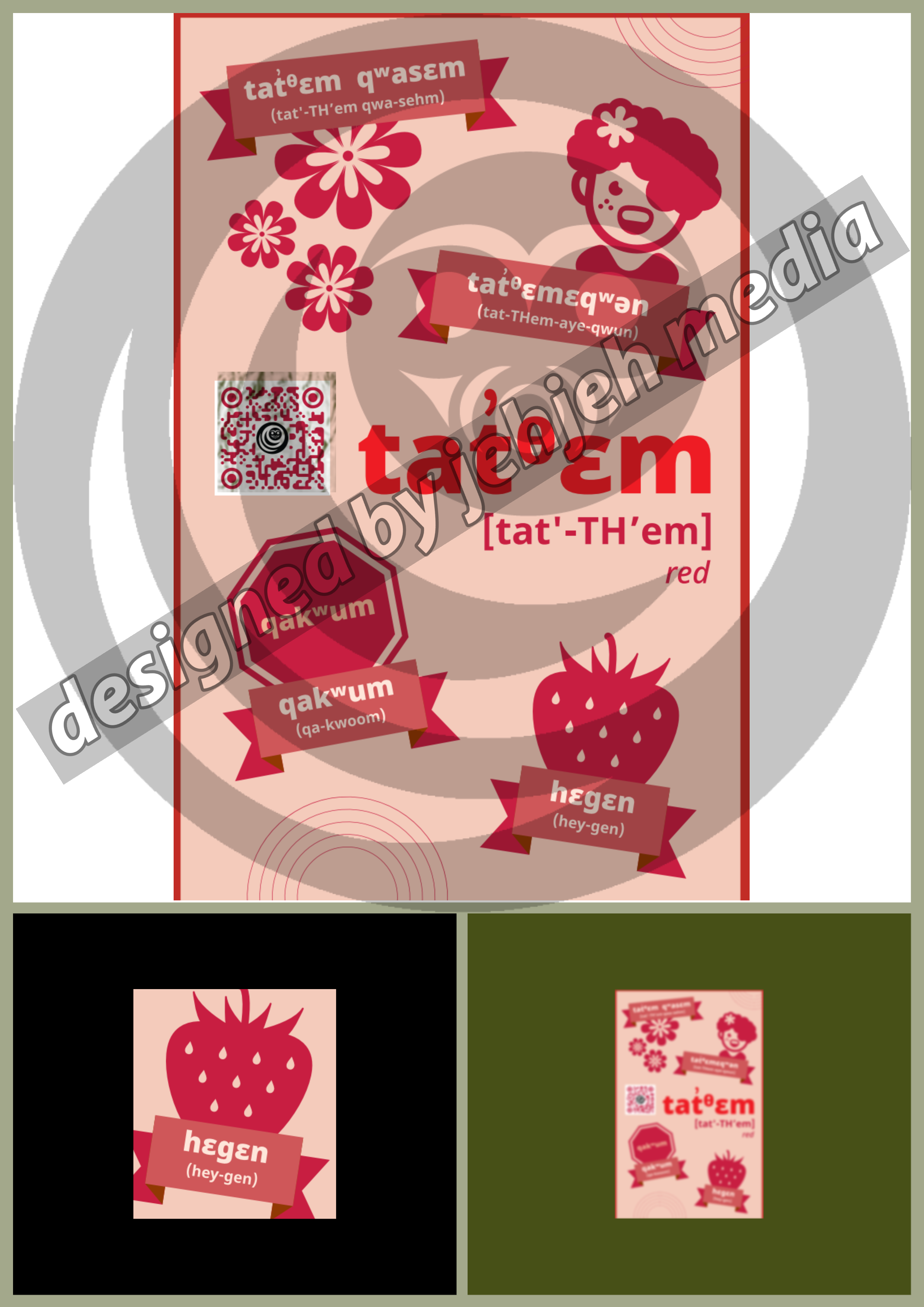Each Poster has at least 4 beings or things associated with each colour. These posters also have qrcodes, that features tla’amin jehahjeh doing read-throughs, to help with pronunciation!